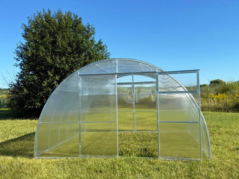 - Zuverlässiges Gestell — stabiles, verzinktes Stahlprofilrohr 40x20 mm, vormontierte Stirnwände, durchgehende Bögen und T-förmige Endungen, die als Anker im Boden oder Fundament dienen.