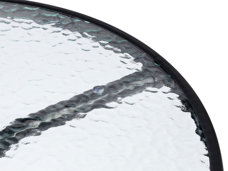 Der Tisch ist mit einer 5 mm starken Sicherheitsglasplatte mit dekorativer Water Wave-Struktur ausgestattet. Sie verleiht dem Produkt ein elegantes Erscheinungsbild und ist besonders pflegeleicht.